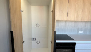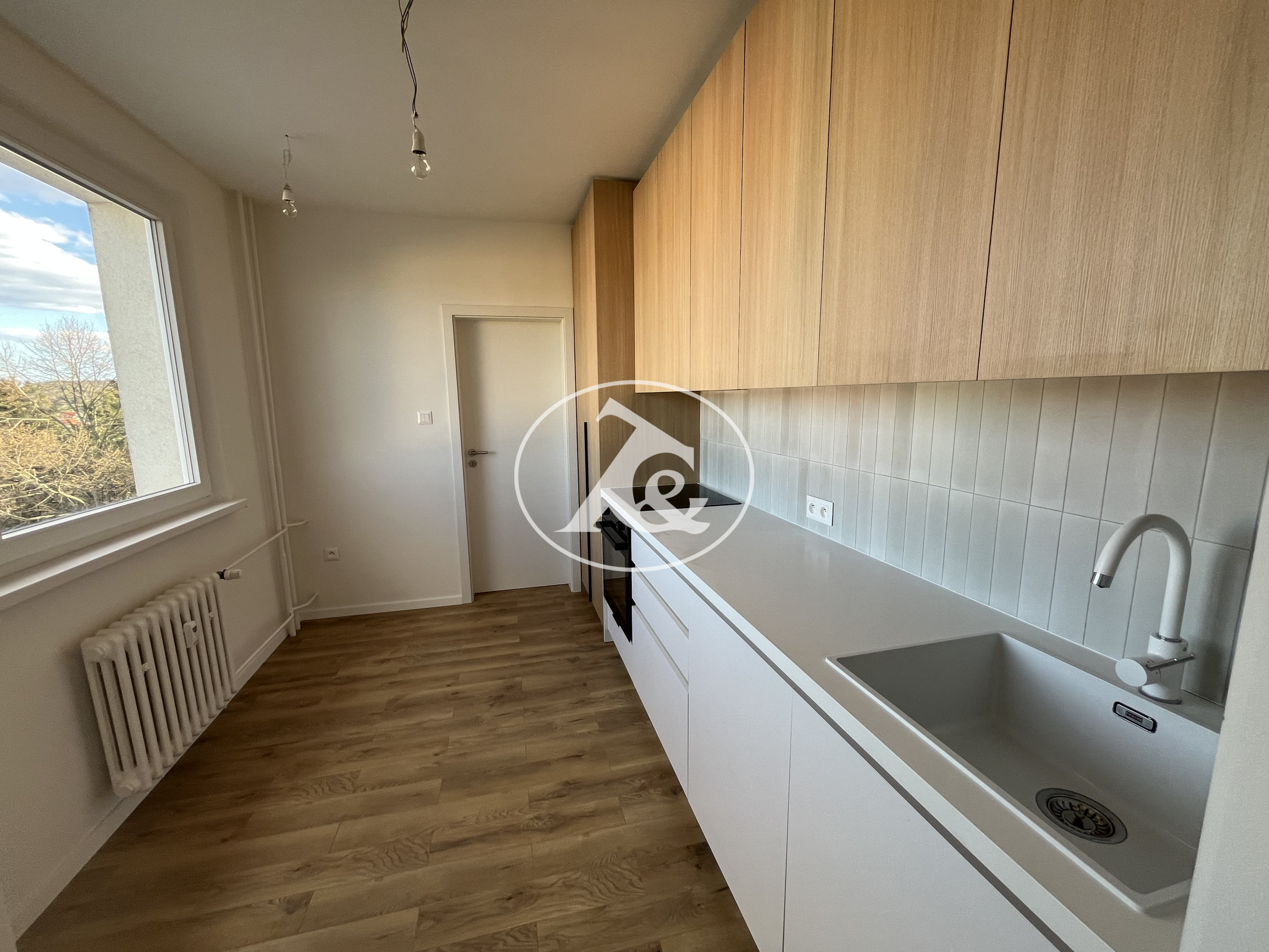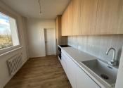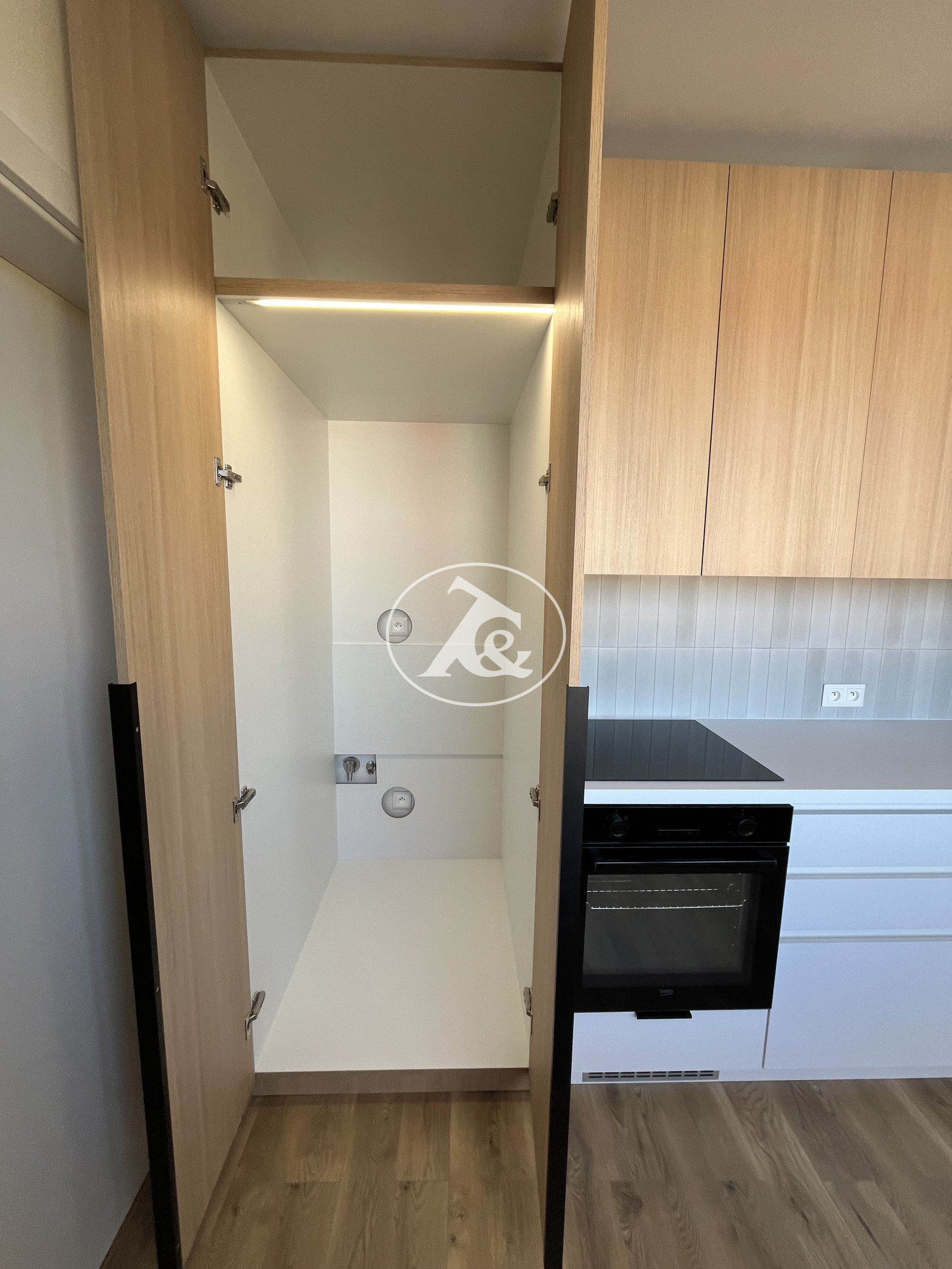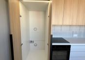 Kuchyňa je vybavená novou kuchynskou linkou so vstavanými spotrebičmi – umývačka riadu, elektrická rúra, indukčná varná doska a digestor. Súčasťou je aj praktický priestor pre práčku so sušičkou a úložné riešenia pre domácnosť.